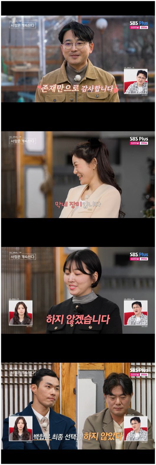 백합은 “3박 4일 동안 잊지 못할 추억 만들어주신 10기 영식님, 매 선택마다 저 선택해 주셔서 감사하고, 22기 영식님 매 순간 저에게 진실되게 저에게 대해주셔서 감사하다”라면서 결국 선택을 포기했다.