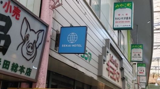 일본 오사카 동쪽 외곽 후세지역에 만들어진 세카이 호텔. 사진은 세카이 호텔 프런트 앞에 걸린 간판. 사진=김형민 기자 |