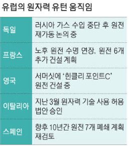 2022년 원자력 발전을 금지한 독일은 그해 러시아의 가스 수입이 중단돼 가스 발전소에 대한 의존도가 높아지자 원자로 재가동 여부를 둘러싸고 논쟁을 벌이고 있다.