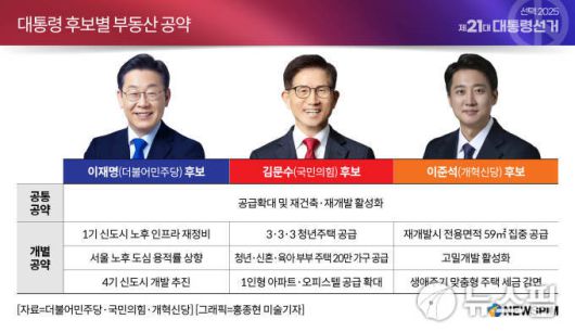 뉴스핌이 16일 분석한 이재명 더불어민주당 후보와 김문수 국민의힘 후보, 이준석 개혁신당 후보의 부동산 공약을 살펴보면 이들은 재건축·재개발 활성화를 통한 주택 공급 확대를 공통 분모로 내세우고 있다.
