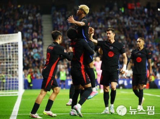 [바르셀로나 로이터 =뉴스핌] 박상욱 기자 = 라민 야말이 16일 스페인 라리가 36라운드 에스파뇰과의 원정 경기에서 선제골을 터뜨리고 동료의 축하를 받고 있다. 2025.5.16 psoq1337@newspim.com |