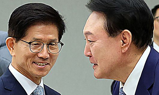 윤석열 당시 대통령이 지난해 8월 30일 김문수 고용노동부 장관에게 임명장을 수여하는 모습. 뉴시스 |