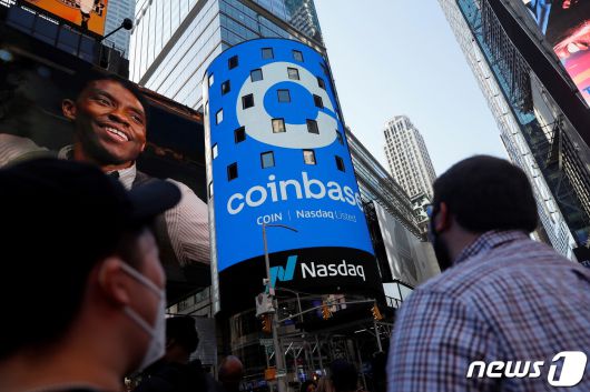 미국 뉴욕 타임스퀘어의 대형 전광판에 14일 나스닥에 상장한 코인베이스의 로고가 나오고 있다. ⓒ 로이터=뉴스1 ⓒ News1 박형기 기자 |