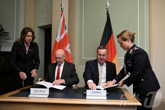 2025년 5월 15일, 독일 베를린에서 열린 트리니티 하우스 국방장관 회의에서 보리스 피스토리우스 독일 국방장관과 존 힐리 영국 국방장관이 영-독 트리니티 하우스 국방 협정 이행을 위한 양자 회담 후 문서에 서명하고 있다. 이날 회담에서 양국은 사거리 2000㎞가 넘는 심층정밀타격 무기를 공동개발하는 데 합의했다. 2025.05.15. ⓒ 로이터=뉴스1 |