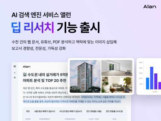 이때 앨런 딥 리서치는 폭넓은 웹 검색은 물론, 필요시 부동산 전문 유튜브 영상까지 분석한 뒤 조사 방향을 유연하게 조정해, 최신 경향을 반영한 깊이 있고 정확한 분석을 제공한다. 보고서에는 시장 동향을 시각적으로 보여주는 그래프 이미지도 포함된다.