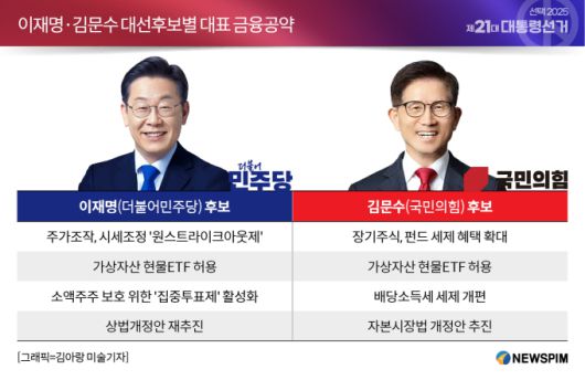 [서울=뉴스핌] 송기욱 기자 = 6.3 대선을 앞두고 주요 대통령 후보들이 일제히 증시 부양 필요성을 제기하고 있다. 이재명 더불어민주당 후보는 주주 환원 강화, 기업지배구조 개선 등 구조적 문제에 초점을 맞춘 반면, 김문수 국민의힘 후보는 세제 혜택을 중심으로 한 자산 증식을 앞세웠다.