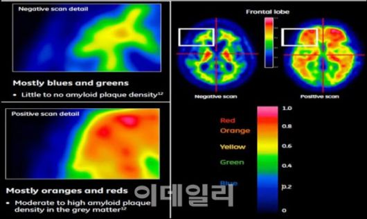 알츠하이머 치매 진단제 ‘비자밀’을 이용한 진단 이미지. 색상으로 베타 아밀로이드 축적 정도를 쉽게 파악할 수 있다. 색상이 파란색이거나 초록색이면 베타 아밀로이드 신경반 밀도가 거의 없다고 판단하며, 주황색 및 빨간색이 나타나면 중증도 이상의 알츠하이머 치매일 가능성이 높다. (자료=듀켐바이오) |