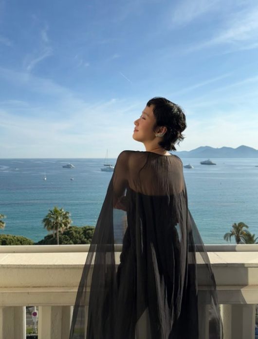 공개된 사진 속에는 푸른 바닷가를 배경으로 발코니에 선 김고은이 우아한 블랙 시스루 슈트 패션과 함께 밝게 미소 짓고 있는 모습이 담겨 있다.