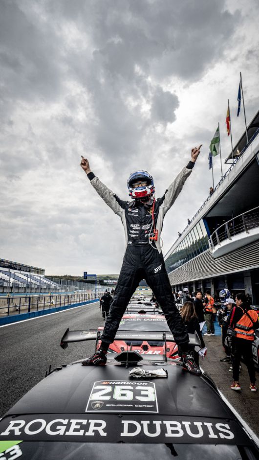 이창우 선수가 2024 람보르기니 슈퍼 트로페오 아시아 AM클래스에서 우승을 차지해 세레머니를 펼치고 있다. |
