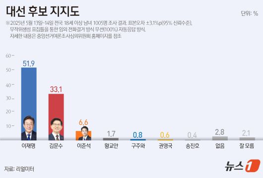 뒤이어 김문수 후보는 33.1%로 30% 초반대를 기록했고 이준석 개혁신당 후보는 6.6%로 집계됐다.