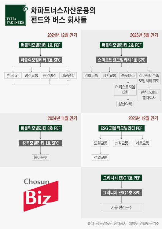 차파트너스는 ‘퍼블릭모빌리티 1호 PEF’를 통해 한국 BRT·명진교통·동인여객·대전승합을, ‘퍼블릭모빌리티 2호 PEF’를 통해 강화교통·삼환교통·송도버스·성산여객·인천스마트합자회사를, ‘퍼블릭모빌리티 3호 PEF’를 통해 동아운수를, ‘ESG퍼블릭모빌리티 PEF’를 통해 도원교통·선일교통·신길교통·세운교통을 갖고 있다.