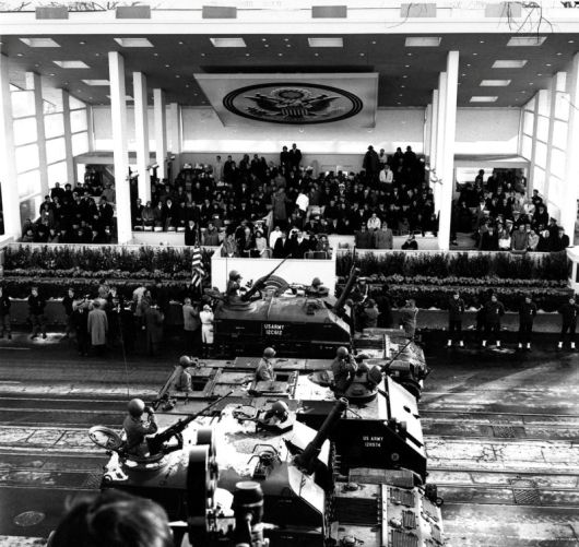 지난 1961년 1월 20일 미국 워싱턴DC에서 열린 존 F. 케네디 미국 대통령의 취임식 가운데 육군 장비들이 행진하고 있다.로이터연합뉴스