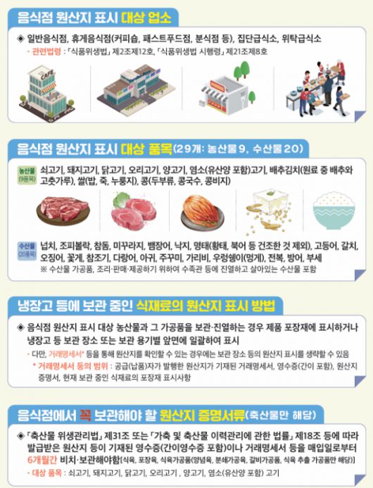 현행법상 음식점이 반드시 원산지를 표시해야 하는 품목은 농산물 3종(쌀, 콩, 배추김치)과 축산물 6종(쇠고기, 돼지고기, 닭고기, 오리고기, 양고기, 염소고기)이다.