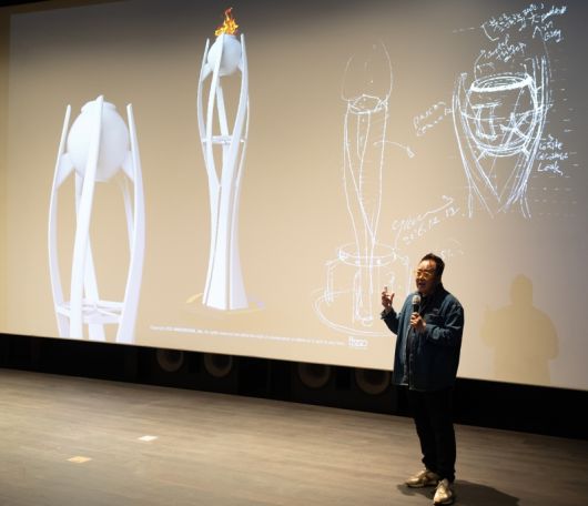 한국이 낳은 세계적인 산업디자이너인 김영세 이노디자인 회장이 코리아헤럴드의 GBF 강연을 통해 자신이 디자인한 2018 평창 동계올림픽 성화대에 대해 설명하고 있다. 그는 평창올림픽 슬로건인 ‘Passion Connected’의 콘셉트에 맞춰 다섯갈래의 줄기가 뻗어가며 위에서 하나로 만나 오각형의 톱의 형태를 형성하는 조형의 디자인을 창조해 한국 디자인의 위상을 높였다는 평가를 받았다. <사진제공=담다스튜디오> |