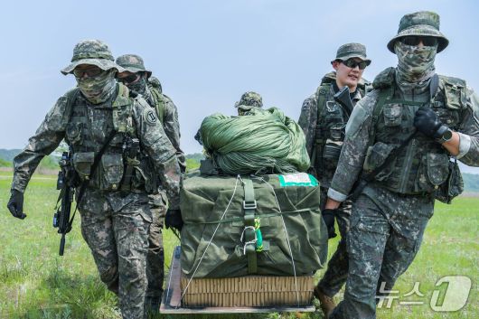 목표지점에 정확히 투하된 재보급 물자를 아군부대가 회수하고 있는 모습. 지상군구성군사령부는 지난 9일부터 16일까지 한미 양국군 장병 200여 명이 참여한 '2025년 전반기 연합합동 공중재보급 훈련'을 실시했다. (육군 제공) |