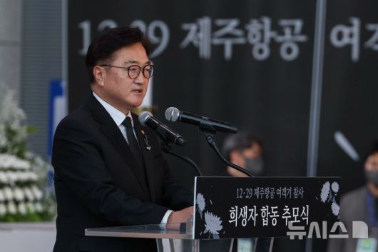 [무안=뉴시스] 이영주 기자 = 우원식 국회의장이 12·29 제주항공 여객기 참사 정부 합동추모식이 열린 18일 오전 전남 무안군 무안국제공항에서 추모식에 참석해 추모사하고 있다. (사진 = 광주·전남사진기자단 공동취재) 2025.01.18. photo@newsis.com
