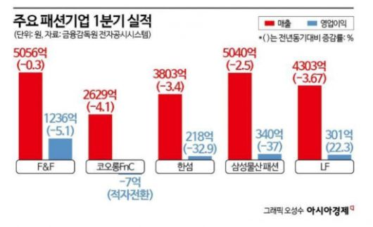 신세계인터내셔날의 영업이익은 46억원으로 전년 대비 59% 줄었다. 매출액은 3042억원으로 전년 대비 1% 감소했다. F&F의 영업이익은 1236억원으로 전년 대비 5.1% 줄었다. 매출 역시 0.3% 감소한 5056억원을 기록했다. 코오롱FnC는 영업손실이 7억원을 기록해 적자 전환했고, 매출은 2629억원으로 4.1% 줄었다. 이들 기업은 실적 악화의 원인으로 일제히 소비심리 위축과 날씨의 영향을 꼽았다.