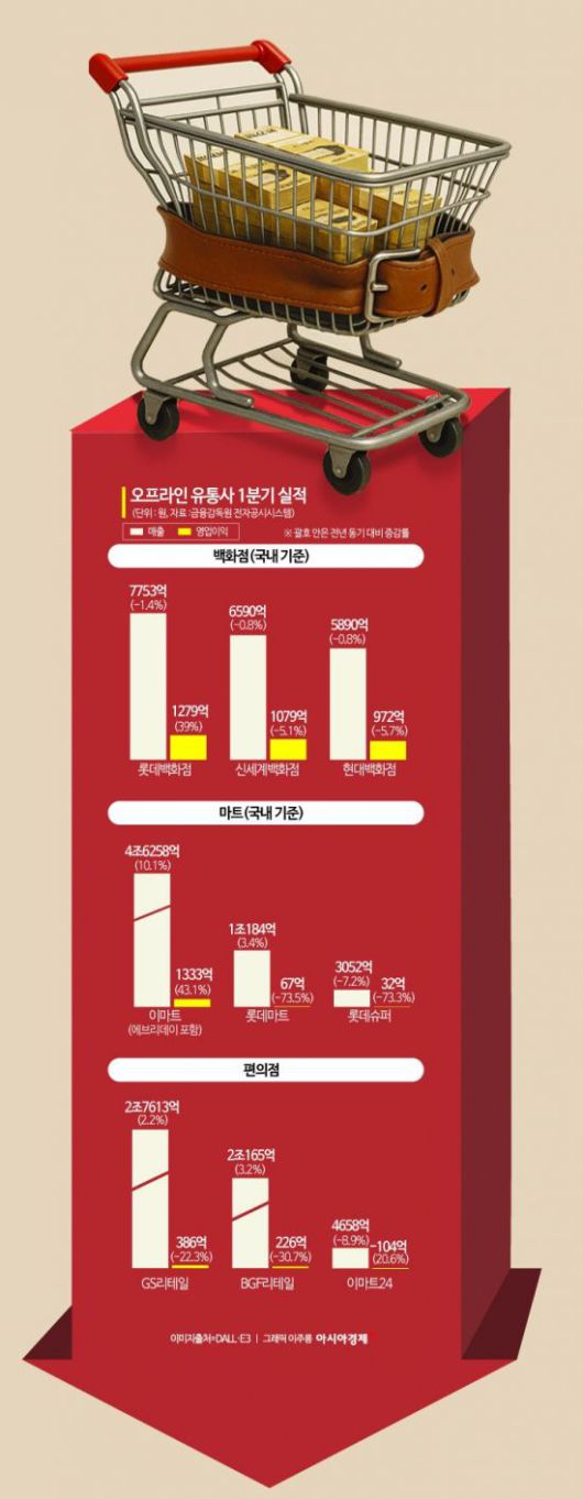 주요 유통 기업들은 고물가로 지갑이 얇아진 소비자들을 겨냥해 할인행사를 확대하고, 비용 절감과 해외 시장에서 돌파구를 찾고 있지만, 온라인 플랫폼의 공세 속에서 내수 부진 파도까지 만나 수익성이 대폭 뒷걸음질했다. 전문가들은 주요 유통기업의 올해 1분기 '어닝쇼크'가 일시적인 경기 부진이 아닌 내수시장 구조 침체의 전조로 해석하고 있다.