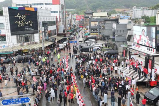 김 후보는 이날 오전 경기도 성남 판교역에서 출근길 인사로 일정을 시작했다. 이어 수원 지동시장을 찾아 "수원이 힘차게 발전할 수 있도록 여러분과 함께하겠다"며 지지를 호소했다.