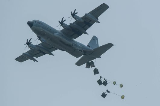 특히 미 해병대 항공전력(KC-130J 수송기)이 지작사 주관 공중재보급 훈련에 참가하기는 이번이 처음입니다. KC-130J는 병력과 장비는 물론 유류도 수송할 수 있습니다.