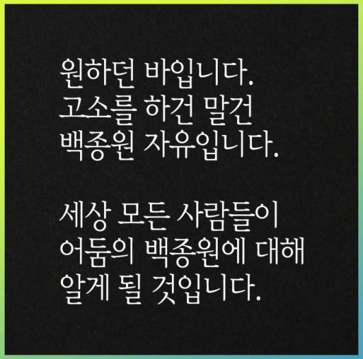 이에 김재환 전 PD는 자신의 유튜브 채널에 '원하던바입니다. 고소하건 말건 백종원 자유입니다. 세상 모든 사람이 어둠의 백종원에 대해 알게 될 것입니다'라고 적은 이미지 파일을 게재했다.