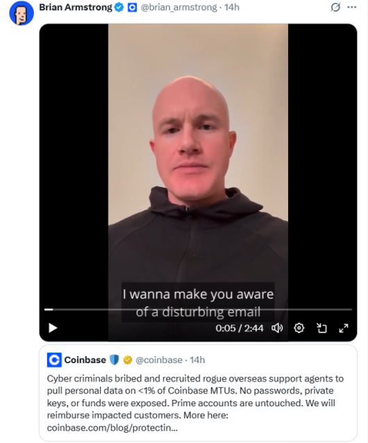 브라이언 암스트롱 코인베이스 최고경영자(CEO)는 자신의 사회관계망서비스(SNS)에 해커들이 회사에 2,000만 달러(약 280억 원)를 요구했다고 적었다. X 캡처