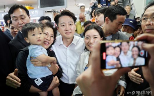 [부산=뉴시스] 하경민 기자 = 이준석 개혁신당 대통령 선거 후보가 14일 부산 중구 자갈치시장에서 시민들과 사진을 찍고 있다. 2025.05.14. /사진=하경민 |