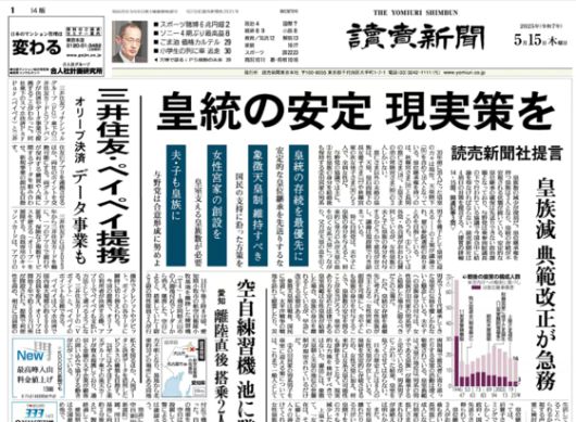 지난 15일 일본 요미우리신문은 1면 톱기사를 비롯해 총 4개의 지면을 할애해 황실전범 개정을 촉구했다.
