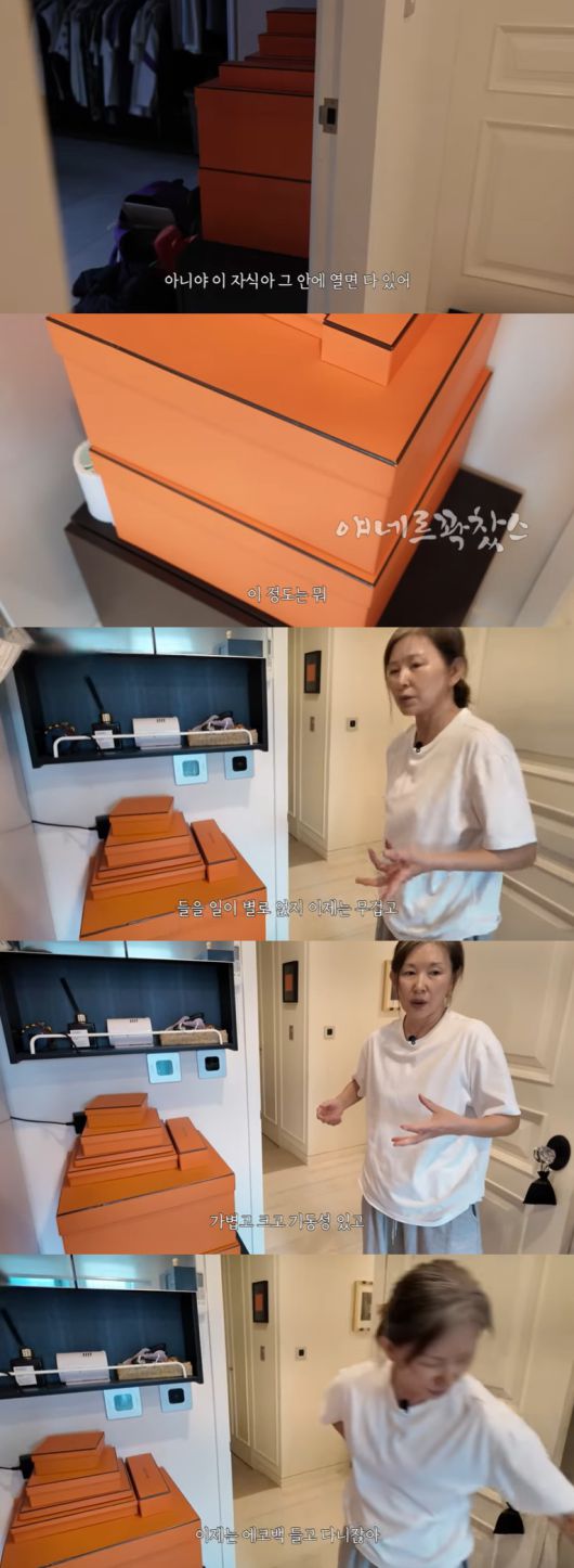 빼곡히 걸려 있는 옷들에 제작진이 "안 입는 옷을 왜"라고 하자 이미숙은 "그래도 걸어 나야지. 버릴 순 없잖니"라고 답했고, 옷장 한켠에 가득 쌓인 명품 브랜드 에르메스 상자들에 제작진은 "박스만 몇 개 달라고 하셨냐"고 물었다.