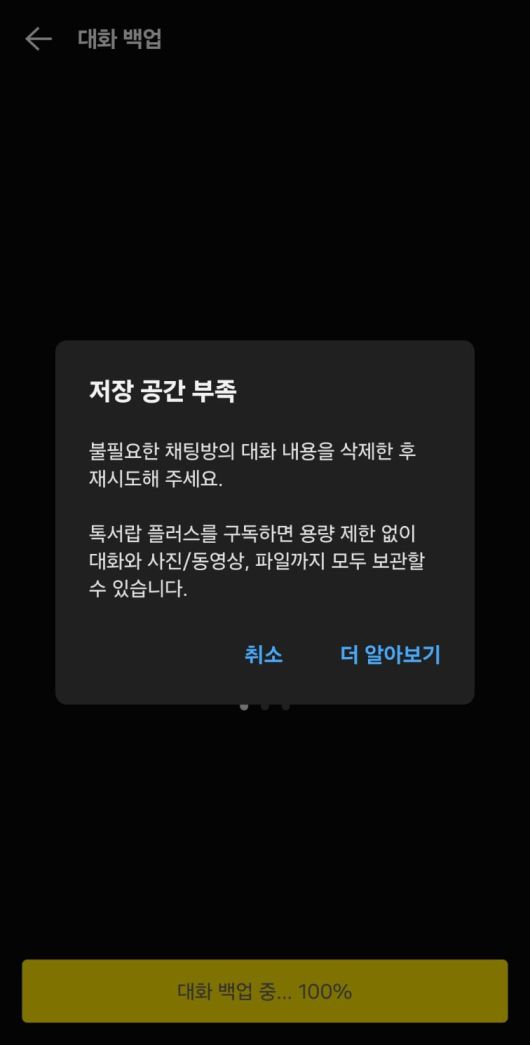 카카오톡 대화 백업 서비스 이용시 '저장 공간 부족' 알림창/독자 제보 |