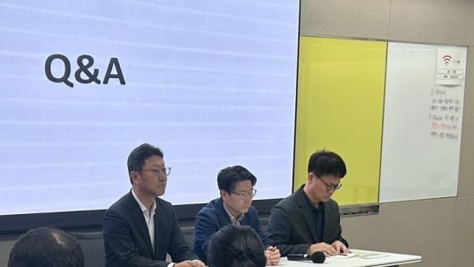 김희섭 PR 센터장, 임봉호 MNO 사업부장, 류정환 네트워크인프라센터장이 16일 서울 중구 삼화타워에서 SKT 일일브리핑을 진행하고 있다. [사진 = 안선제기자] |