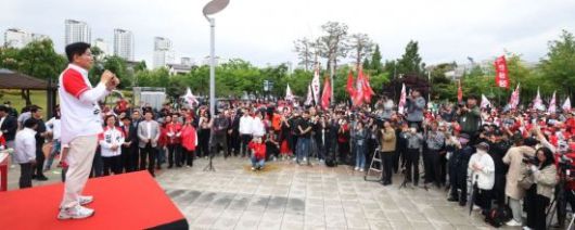 김문수 국민의힘 대선 후보가 16일 경기 화성시 동탄 센트럴파크 음악분수중앙광에서 시민들에게 지지를 호소하고 있다. <ⓒ투자가를 위한 경제콘텐츠 플랫폼, 아시아경제(www.asiae.co.kr) 무단전재 배포금지>