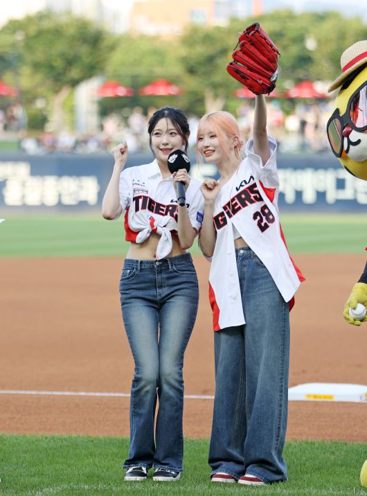걸그룹 프로미스나인의 송하영(오른쪽)과 백지헌이 지난해 8월 6일 광주-기아챔피언스필드를 방문해 승리기원 시구 및 시타에 앞서 팬들에게 인사하고 있다. 사진=KIA타이거즈 제공 |