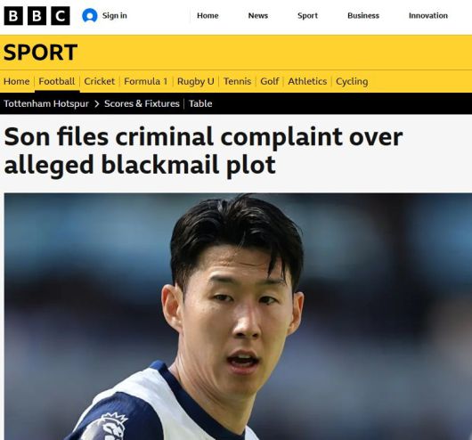 영국 공영방송 'BBC'는 15일(한국시간) "토트넘의 주장 손흥민은 한 여성으로부터 임신했다는 거짓 주장으로 협박을 받았다는 보도가 나온 후 한국 경찰에 형사고발을 제기했다"라고 보도했다.