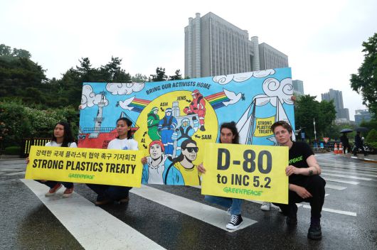 영국과 독일, 멕시코 국적 활동가 4명은 지난해 11월 부산에서 열린 유엔 국제 플라스틱 협약 제5차 정부간 협상회의(INC5) 때 플라스틱 원료를 운반하는 선박에 올라 ‘강력한 국제 플라스틱 협약(Strong Plastics Treaty)’ 메시지가 담긴 배너를 펼치는 등 해상 시위를 벌였다. 이들 활동가들은 해상 시위로 재판에 넘겨졌고 출국금지 상태로 한국에 체류 중이다.