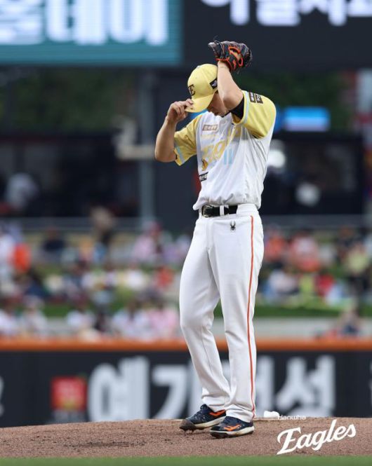 프로야구 한화의 엄상백이 15일 대전 한화생명 볼파크에서 열린 두산전에서 모자를 고쳐 쓰고 있다. 한화 제공 |