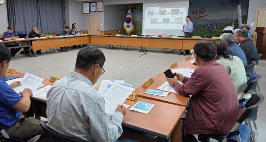 한국환경보전원 담당자가 16일 경기도 이천시 율면 행정복지센터에서 지역 이장단에게 야적퇴비 관리 교육을 하고 있다./한강청 |
