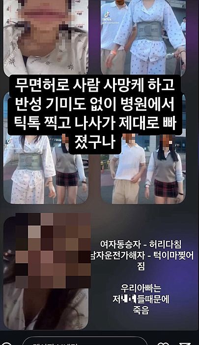 A씨는 SNS에 이들의 영상을 갈무리해 올리기도 했다. 그는 “무면허로 사람 사망케 하고 반성의 기미도 없이 병원서 틱톡 찍고 나사가 제대로 빠졌구나. 우리 아빠는 저 XX들 때문에 죽음. 어이가 없다. 개죽음당한 우리 아빠 진짜 억울해서 눈 못 감는다. 살려주세요”라고 적었다.