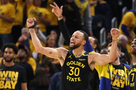 2025년 5월 2일(현지시간), 미국 캘리포니아 샌프란시스코 체이스 센터에서 열린 NBA 서부 콘퍼런스 1라운드 6차전 경기 2쿼터 도중, 골든스테이트 워리어스의 스테픈 커리(등번호 30번)가 팀 동료 지미 버틀러 3세(등번호 10번)의 득점에 환호하고 있다. 상대는 휴스턴 로키츠. |