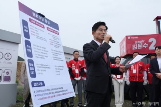 16일 오후 3시쯤 세종시 국회 세종의사당 부지 입구. 김문수 국민의힘 대선 후보는 이준배 세종시당위원장이 대통령 집무실 건립, 국회의사당 완전 이전과 관련해 두 가지 제안을 발표하자 "말씀해주신 것들 전부 다 동그라미"라며 "이하 모두 같은 생각"이라고 말했다.
