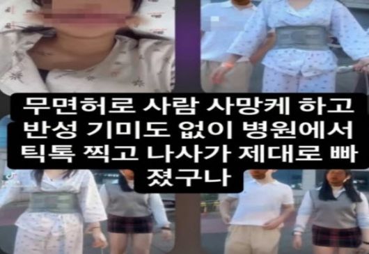 A씨는 이들의 영상을 캡처해 SNS에 공유하며 “무면허로 사람 사망케 하고 반성의 기미도 없이 병원에서 틱톡 찍고 나사가 제대로 빠졌구나. 우리 아빠는 저 새X들 때문에 죽음. 어이가 없다. 개죽음당한 우리 아빠 진짜 억울해서 눈 못 감는다. 살려주세요”라고 절규했다.