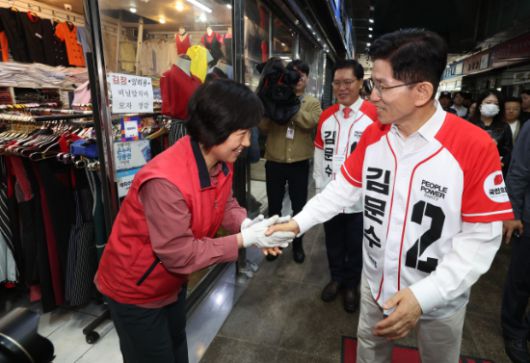 김문수 국민의힘 대선 후보가 5월 16일 경기 수원시 지동시장에서 상인과 악수하고 있다. (출처=연합뉴스) |