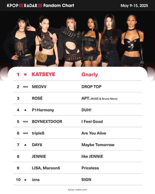 '케이팝레이더' 위클리 팬덤 차트는 아티스트의 성장 지표, 특히 성장률을 분석해 매주 발표하며, 캣츠아이는 신곡 '날리(Gnarly)'로 16일 공개된 해당 차트에서 다시 한번 1위에 올랐다.