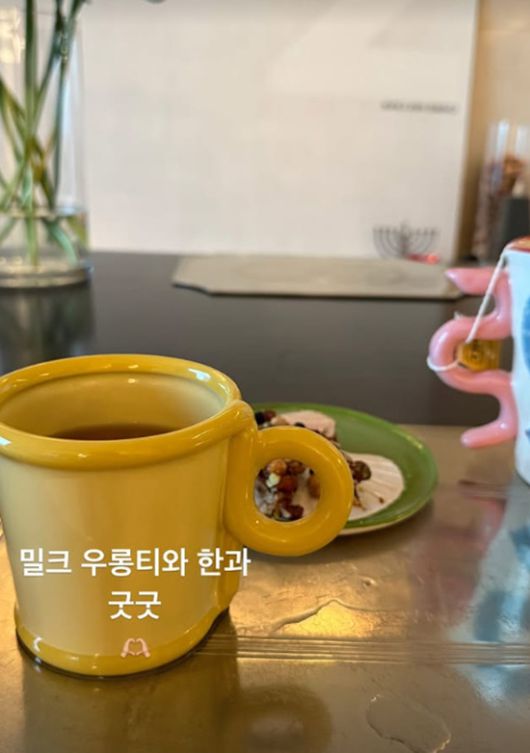 이어진 사진에는 "밀크 우롱티와 한과 굿굿. 생강차 뜨겁게 & 차갑게"라는 문구와 함께 따뜻한 차와 간식이 담긴 사진을 공개했다. 밝은 색감의 식기가 시선을 사로잡았다.