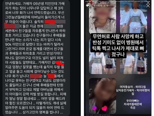 B씨는 "가해자들은 감형받으려고 친구나 선배, 후배들에게 탄원서를 써달라고 부탁하고 있다. 가해자들이 강력한 처벌을 받길 원한다"며 "이렇게라도 가해자들 실체를 알려드리면 도움이 되지 않을까 싶어 연락드렸다"고 덧붙였다.