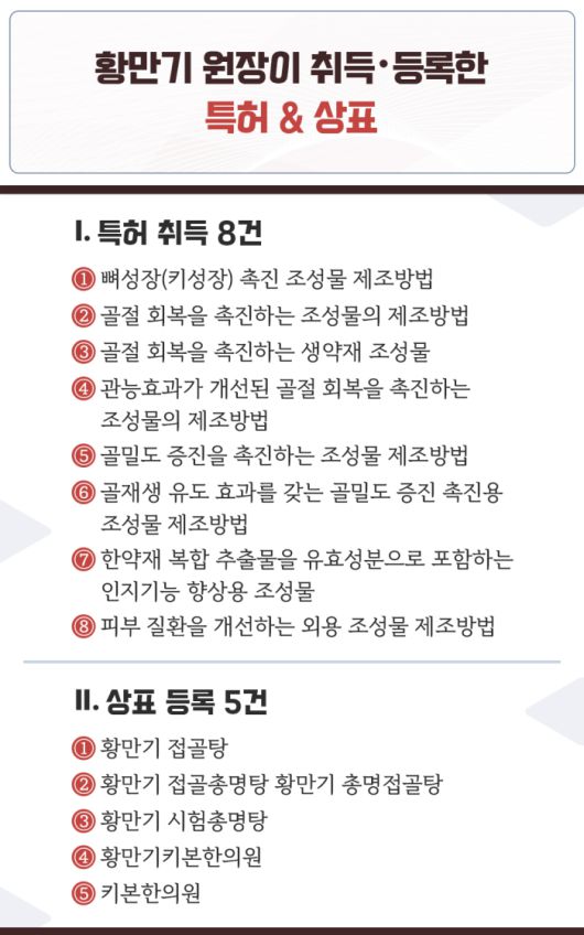 그는 △키(뼈) 성장 △골절‧골다공증 등 뼈 건강 △아토피 피부염 △인기기능 치료와 관련된 특허를 8개나 취득했다. 8건 중 키 성장, 골절, 골다공증 등 3개 분야는 미국 특허를 출원한 상태다. 상표등록도 5건 있다.