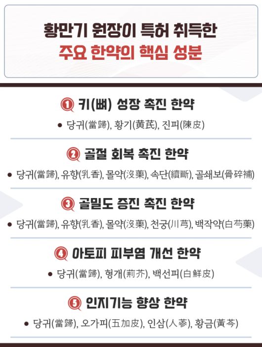 세부적인 특허 취득 과정은 이렇다. 동의보감에서 첫 번째 힌트를 얻고, 중약대사전과 일본 자료들을 참고한다. 이어 연령별‧환자별로 한약재들을 가감해서 △동물 실험 △세포 실험 △임상 시험 등 현대화된 연구를 통해서 안전성과 효과가 확인되면 특허를 출원‧취득한다. 이 같은 과정에는 25년의 진료 노하우와 임상 경험이 녹아 있다.