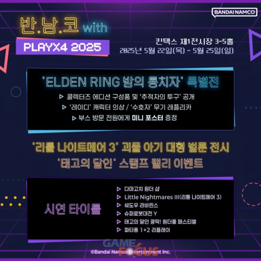 ‘2025 플레이 엑스포’ 참가 상세 내용 공개 반다이남코 엔터테인먼트 코리아의 ‘2025 플레이 엑스포’ 부스에서 ‘ELDEN RING 밤의 통치자’ 특별전을 진행한다. 특별전에 방문하시는 분들에게는 ‘ELDEN RING 밤의 통치자’의 미니 포스터를 증정한다.