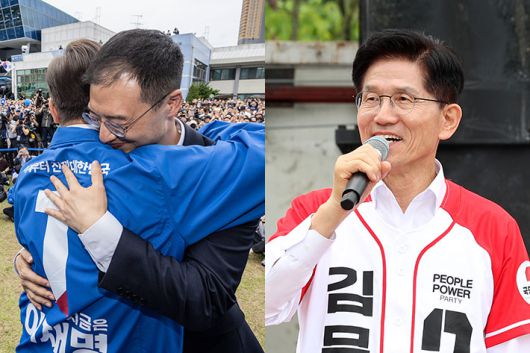 익산 유세 찾은 무소속 김상욱 의원과 포옹하는 더불어민주당 이재명 후보(왼쪽), 오른쪽은 국민의힘 김문수 후보. 윤창원 기자·연합뉴스 |