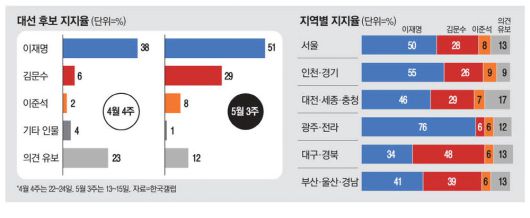 지역별로 봐도 이재명 후보 대세론이 드러난다. 그는 국민의힘 텃밭으로 분류되던 대구경북(TK) 지역에서조차 34%의 지지를 받으며 48%를 얻은 김 후보를 추격하고 있다. 또 부산·울산·경남 지역에서는 이재명 후보가 41%로 김 후보(39%)와 오차범위 안에 있다.